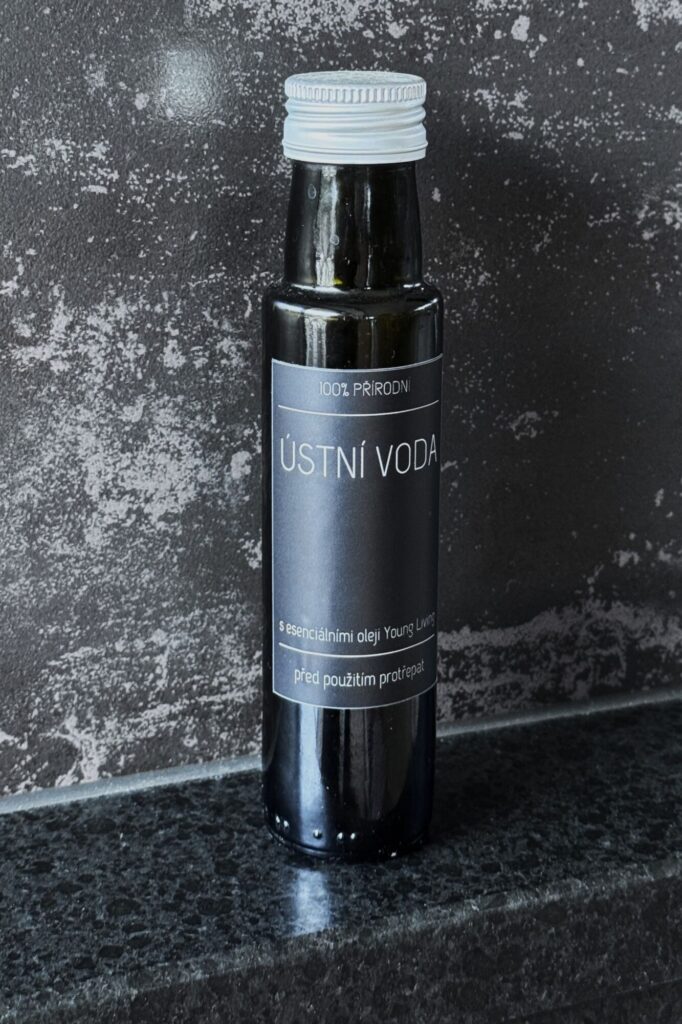 Samolepka z vysoce kvalitního materiálu odolného působení esenciálních olejů a vody. TEXT na samolepce: 100% přírodní ÚSTNÍ VODA s esenciálními oleji Young Living, před použitím protřepat.